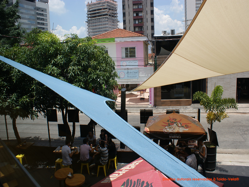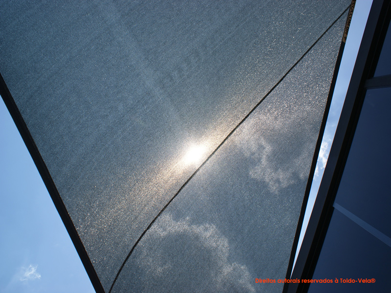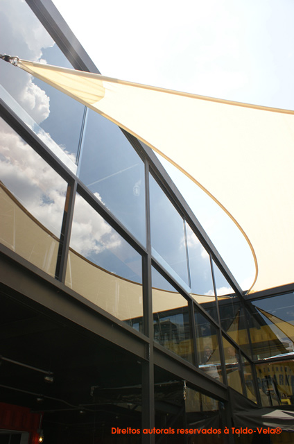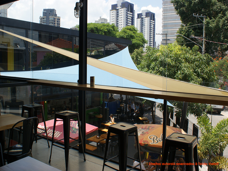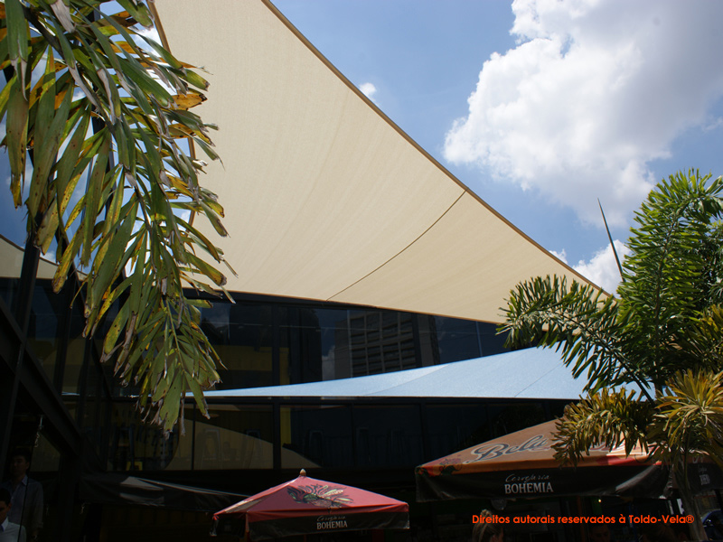 Foram utilizados tecidos arquitetônicos da Gale Pacific – Commercial® 95, nas cores Natural e Sky Blue. Foram confeccionadas duas peças de 80m2 no total.