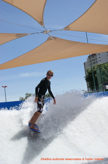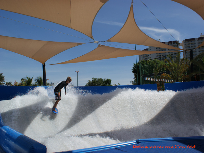 A Toldo-Vela® foi contratada para fazer a cobertura de toda a extensão da piscina de Surf, com o intuito de reduzir os raios solares que incidem nos praticantes de surf.